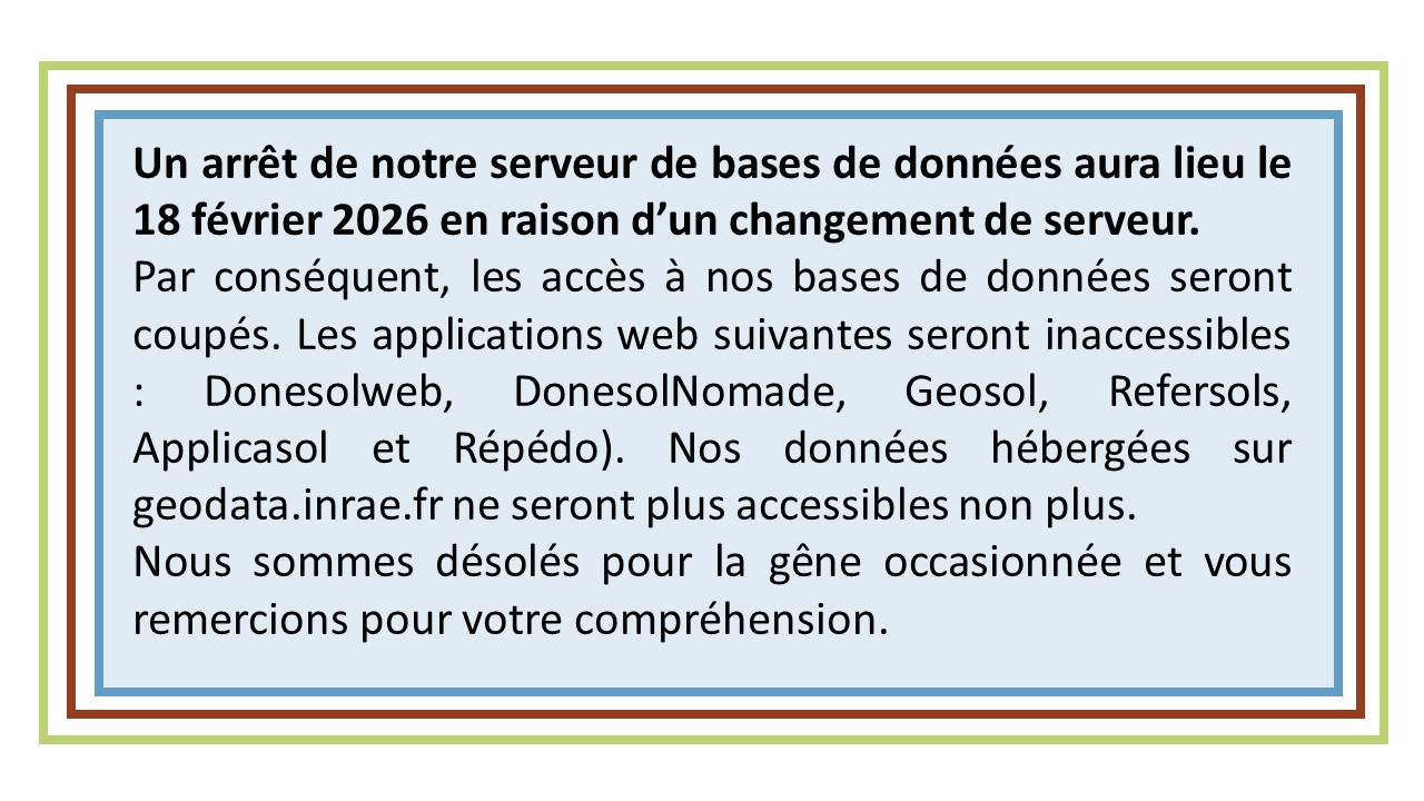 Par conséquent, les accès à nos bases de données seront coupés. Les applications web suivantes seront inaccessibles : Donesolweb, DonesolNomade, Geosol, Refersols, Applicasol et Répédo). Nos données hébergées sur geodata.inrae.fr ne seront plus accessibles non plus.